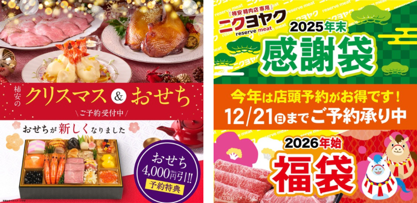 洋惣菜ブランド「柿安ダイニング」、並びに精肉ブランド「柿安 精肉店」では、クリスマス・年末年始のご馳走を、それぞれWEBからご予約可能な「カキヨヤク」「ニクヨヤク」にて承ります。